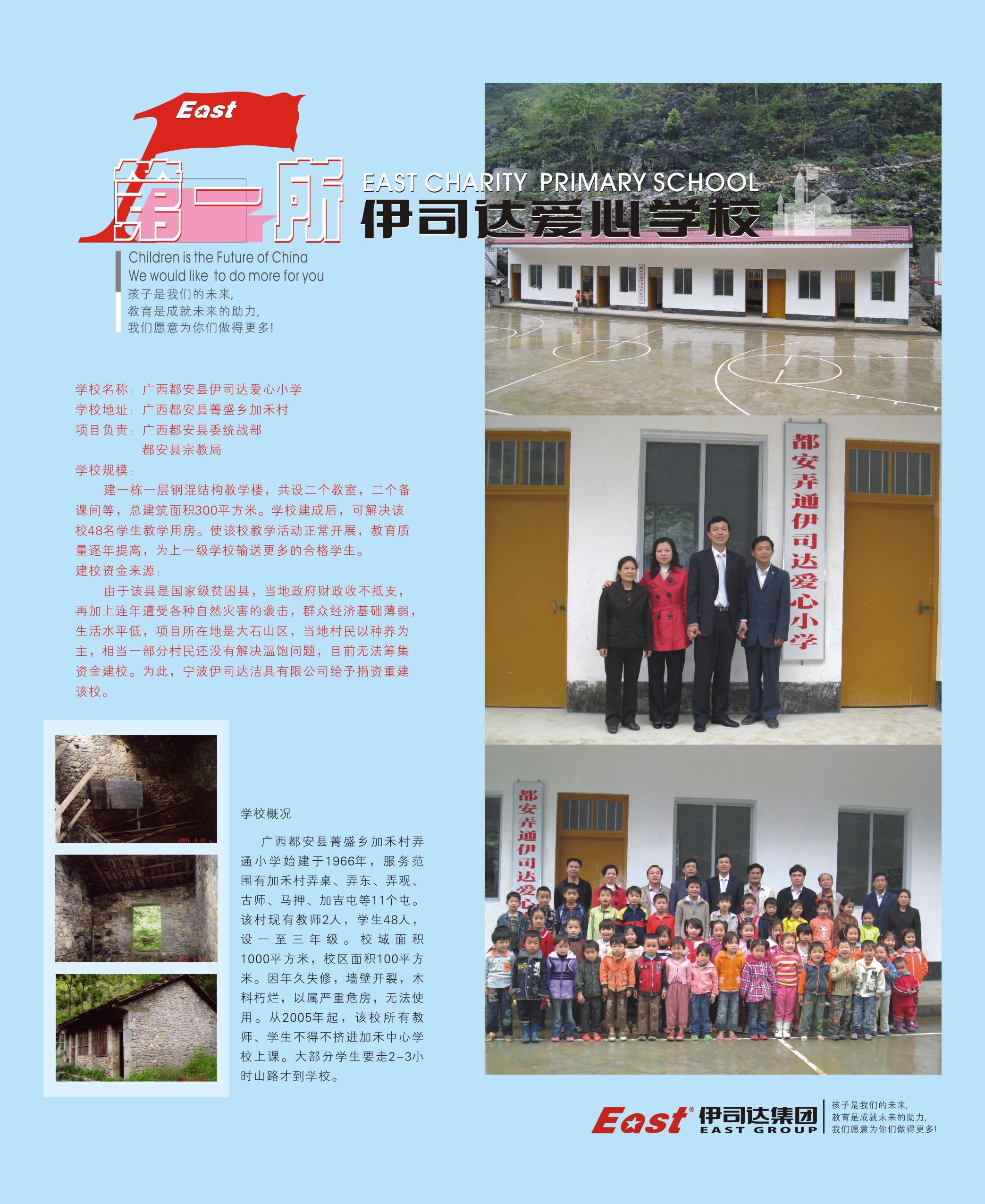2007年6月20日,寧波伊司達(dá)潔具有限公司捐資廣西都安縣小學(xué),重建該小學(xué),學(xué)校建成后,可解決該校48名學(xué)生教學(xué)用房。